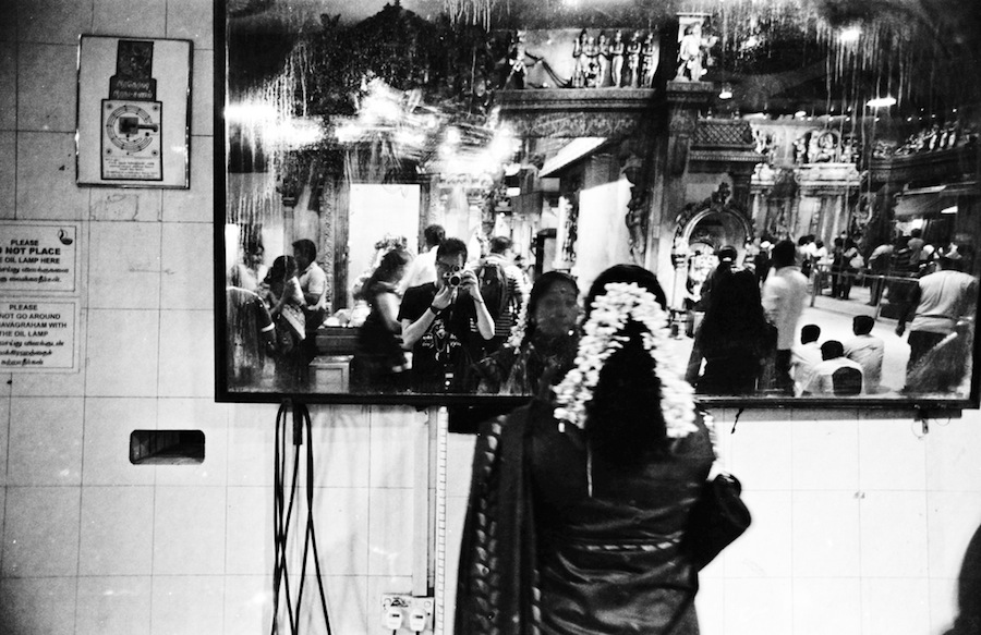 I was shooting in this Indian Hindu Temple along Little India when I saw this Indian lady powdering her makeup on with the aid of the huge mirror. I thought it would be quite nice to take a portrait of myself including her and the surroundings in it. – Gary Wang